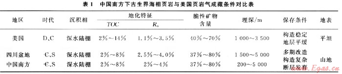 1) 中國南方海相頁巖沉積時(shí)代比美國老,主要以早古生代寒武紀(jì)和志留紀(jì)為主。日前美國頁巖氣開發(fā)的5個(gè)主要盆地中,頁巖的形成時(shí)代以晚古生代泥盆紀(jì)、密西西比紀(jì)和中生代白堊紀(jì)為主。