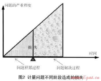 一般在發(fā)生卡表計(jì)量問題的情況下,燃?xì)馄髽I(yè)往往是承擔(dān)損失的一方,由于計(jì)量問題所帶來的流量損失,與“問題的程度”和“發(fā)現(xiàn)及處理問題所用的時(shí)間”成正比關(guān)系。計(jì)量問題的出現(xiàn)往往是時(shí)間積累的結(jié)果,如圖2所示,計(jì)量問題經(jīng)過一段時(shí)間的積累,達(dá)到一定的“度”,從而引起關(guān)注,在問題積累的過程中已經(jīng)給企業(yè)帶來了一定的損失,問題出現(xiàn)后往往還需要相當(dāng)一段時(shí)間加以解決,而解決問題的過程無疑將積累更多的損失。燃?xì)夤緸榇怂冻龅臅r(shí)間成本相當(dāng)可觀。