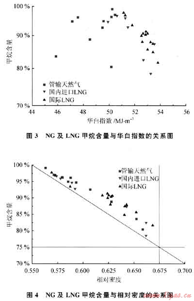 同樣,限定相對密度的范圍與限定甲烷的最低含量具有同樣的功效。甲烷值和辛烷值有非常確定的關(guān)系,是抗爆燃的重要參數(shù)。圖3、4分別給出了甲烷含量與華白指數(shù)和相對密度的關(guān)系。