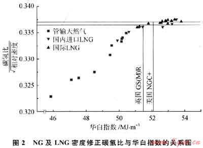 對華白指數(shù)限定范圍的控制是天然氣利用的安全性、環(huán)境排放和效率的保證。燃?xì)獾奶細(xì)浔葦?shù)決定了不完全燃燒指數(shù)的大小或燃燒的C0排放量。圖2給出了相對密度修正的碳?xì)浔群腿A白指數(shù)的關(guān)系。由此可見控制華白指數(shù)范圍與控制碳?xì)浔鹊淖兓粯?,具有限定不完全燃燒指?shù)或黃焰指數(shù)的同樣功效。圖2中GS(M)R是英國燃?xì)獍踩芾硪?guī)范“Gas Safety(Management)Regulations”的縮寫。
