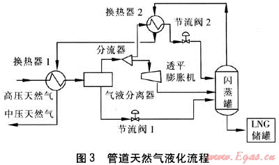 高壓天然氣經(jīng)換熱器1預(yù)冷部分液化后,進(jìn)入氣液分離器,分離出的液相經(jīng)節(jié)流閥膨脹至中壓,溫度降低,形成氣液混合物。分離出的氣相經(jīng)分流器分為兩股,一股進(jìn)入膨脹機(jī)膨脹至中壓,溫度劇降,形成氣液混合物;另一股經(jīng)換熱器2預(yù)冷部分液化后,再經(jīng)節(jié)流閥膨脹至中壓后,也形成氣液混合物。三股氣液混合物一起送到閃蒸罐中,分離出氣相天然氣(中壓)和LNG,前者作為原料氣預(yù)冷冷源,換熱后進(jìn)入中壓管網(wǎng),后者進(jìn)入LNG儲(chǔ)罐儲(chǔ)存。在城市門站安裝帶膨脹機(jī)的天然氣液化裝置,用氣低谷時(shí)通過膨脹機(jī)產(chǎn)生冷量用于天然氣液化。生成的LNG輸入儲(chǔ)罐,用氣高峰時(shí)將其氣化起到調(diào)峰作用。