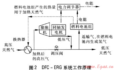 近年來,美國(guó)、英國(guó)一些公司將膨脹機(jī)技術(shù)與其他技術(shù)聯(lián)合,以回收調(diào)壓過程中的壓力能,研究工作取得了一定進(jìn)展。2008年10月,北美Enbridge公司將膨脹機(jī)與燃料電池組合在一起形成DFC-ERG系統(tǒng)[6],并在加拿大多倫多門站進(jìn)行了現(xiàn)場(chǎng)試驗(yàn),該聯(lián)合裝置的發(fā)電功率為2200kW。DFC-ERG系統(tǒng)工作原理見圖2。