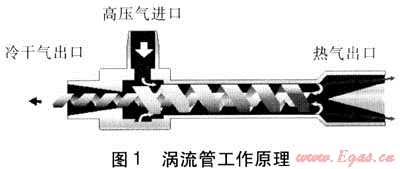 以只輸入一定壓力的壓縮空氣為例,通過渦流管處理,一端產(chǎn)生冷空氣(在干燥空氣的前提下最低溫度可達(dá)-46℃),另一端產(chǎn)生熱空氣(最高溫度可達(dá)127℃)。利用冷、熱端氣體溫度的不同,可分別提供制冷或加熱,使能量得到充分利用。渦流管制冷效果介于節(jié)流閥和膨脹機(jī)之間。