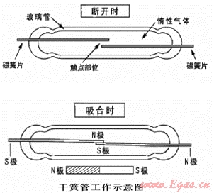 干簧管由一對(duì)由磁性材料制造的彈性磁簧組成,磁簧密封于充有惰性氣體的玻璃管中,磁簧端面互疊,但留有一條細(xì)間隙。磁簧端面觸點(diǎn)鍍有一層貴金屬,使開關(guān)具有穩(wěn)定的特性和延長使用壽命。