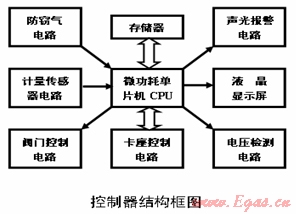 2、控制器:控制器一般由計(jì)量傳感器電路、微功耗單片機(jī)、微功耗閥門、電壓測試電路、防竊氣電路等部分組成(如圖所示)。具有精確記數(shù)功能、功能卡傳輸媒介功能、閥門自動(dòng)處理功能、非法操作處理功能、欠壓處理功能、掉電處理功能、數(shù)據(jù)下載功能、數(shù)據(jù)顯示與聲音提示功能等。采用單片機(jī)對(duì)傳感器的脈沖進(jìn)行計(jì)量、分析處理,并驅(qū)動(dòng)相應(yīng)的部件進(jìn)行控制。主要包括CPU、讀寫卡接口、顯示、計(jì)數(shù)等輔助部件,是IC卡燃?xì)獗淼暮诵脑O(shè)備。