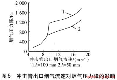 當h=100mm、沖擊管出口煙氣流速為5.0~9.0m/s時,液位由低液位溢流管控制。當沖擊管煙氣出口流速超過9.0m/s時,液位開始下降,低液位溢流管失效,隨著沖擊管煙氣出口流速的進一步提高,煙氣壓力降隨之增大。當沖擊管出口煙氣流速為18m/s時,壓力降為1800Pa。總氣量分為兩部分:一部分由上升通道流出,另一部分通過排孔流出。流量比例與上升通道幾何尺寸、煙氣流速、攜帶液量、排孔開孔率以及孔排列方式有關,兩部分流動阻力相等。