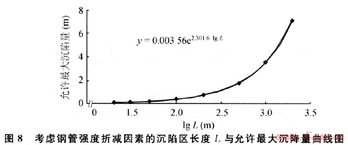 2) 根據(jù)《輸氣管道工程設(shè)計規(guī)范》[3]的有關(guān)規(guī)定,在輸氣管道系統(tǒng)中,支管道沒有軸向約束(如固定支墩或其他錨固件)時,使管道附件產(chǎn)生的彎曲應(yīng)符合公式:σe≤0.72σse為組合應(yīng)力;σs為管道的最低屈服強(qiáng)度),按假設(shè)受力模型的簡化分析和采用的算例,X70鋼管屈服強(qiáng)度為485MPa,則0.72σs=349.2MPa,可得管道通過不同長度沉陷區(qū)的允許最大沉陷量和其回歸方程(圖8)。
