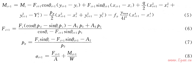 B點(diǎn)作為第l點(diǎn),則可由式(5)~(8)遞推出沉陷區(qū)管段各點(diǎn)的彎矩、軸力和土的被動抗力: