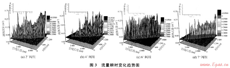 從圖3可以看出隨著清管的進(jìn)行,清管器下游段塞長(zhǎng)度逐漸增加。在下游段塞還沒(méi)有到達(dá)終端之前,終端的液體流量基本保持在0.0003m3/s左右不變,隨著清管的進(jìn)行,當(dāng)清管器前面的段塞到達(dá)終端后,終端液體流量變化十分劇烈,各閥組終端液體流量由零迅速增加,通過(guò)終端的液體累計(jì)量呈線(xiàn)性增長(zhǎng),各閥組出口液體累積量為:4510kg(6#閥組)、13674kg(2#閥組)、6385.6kg(4#閥組)、11012kg(7#閥組);段塞到達(dá)終端后各閥組段塞收集時(shí)間為:101.1s(6#閥組)、100.8s(2#閥組)、40.1s(4#閥組)、40.3s(7#閥組)。當(dāng)清管結(jié)束后,終端液體流量接近零,幾乎全為氣體即出現(xiàn)了所謂的段流現(xiàn)象。在整個(gè)清球過(guò)程中,液體流量在地形起伏較大的上升管段和下降管段的凹凸結(jié)合處會(huì)發(fā)生較大的波動(dòng)。這是流體在上升管路處清管器前端液體由于自重堆積造成的結(jié)果;而在下降管路處由于清管器前后端液體自重及清管器自重的影響使清管器前端液體流速迅速增加。這種現(xiàn)象對(duì)高程變化較大的4個(gè)閥組尤為明顯。