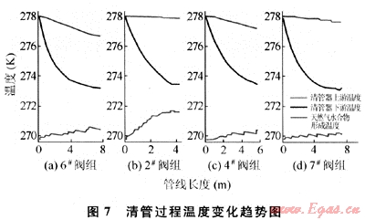 分析,獲取了清管后各閥組管線(xiàn)恢復(fù)穩(wěn)態(tài)的時(shí)間。采用瞬態(tài)分析方法對(duì)清管器運(yùn)行中溫度變化研究的結(jié)論表明:各閥組在清管過(guò)程中沒(méi)有天然氣水合物的形成。進(jìn)一步驗(yàn)證了清管節(jié)流理論的正確性。