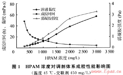 將主劑聚丙烯酰胺(YG100)按實(shí)驗(yàn)要求的濃度預(yù)先配制溶解好,交聯(lián)劑(YG102-1及G102-3)按一定濃度預(yù)先配制好。實(shí)驗(yàn)時取一定量預(yù)先溶解好的HPAM溶液于燒杯中,再按照配方要求分別將交聯(lián)劑加入,同時攪拌均勻即形成調(diào)剖劑溶液。將調(diào)剖劑溶液倒入試管并密封,放入一恒溫水浴中,記下放入時間,定期觀察溶液的流動情況(用燒杯倒出觀察),溶液不流動時或明顯形成具有一定舌長的凝膠時的時間與放入時時間差即為成膠時間。采用德國HAAKE公司生產(chǎn)的RS-150流變儀測定交聯(lián)體系的表觀黏度、黏彈性強(qiáng)度(主要是彈性模量)。