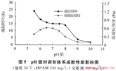在HPAM/Cr3+交聯(lián)體系中,pH值對體系溶液是否成膠有著決定性的影響,對HPAM—YG102-3交聯(lián)體系成膠性能影響實(shí)驗(yàn)結(jié)果見表1、圖5。