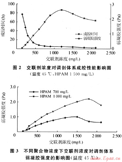 由圖2、圖3可見,聚合物濃度一定時,交聯(lián)劑濃度增加,體系成膠時間縮短,形成的弱凝膠強(qiáng)度增加,這是因?yàn)榻宦?lián)劑濃度增加,聚合物交聯(lián)機(jī)會及弱凝膠分子間交聯(lián)密度增加所致。但交聯(lián)劑濃度過高時,體系形成的弱凝膠反而有所降低,長期放置觀測發(fā)現(xiàn)弱凝膠不穩(wěn)定,有輕微脫水現(xiàn)象。這是因?yàn)榻宦?lián)劑濃度過高,體系反應(yīng)形成凝膠后,溶液內(nèi)部的活性基團(tuán)與交聯(lián)劑之間的化學(xué)反應(yīng)仍在進(jìn)行,這會使凝膠的交聯(lián)點(diǎn)增加,交聯(lián)密度增大導(dǎo)致凝膠的分子線團(tuán)發(fā)生收縮,從而出現(xiàn)脫水和破膠現(xiàn)象。同時交聯(lián)劑濃度太小時,體系交聯(lián)不充分或不能有效地進(jìn)行交聯(lián),形成的凝膠太弱或不能形成整體凝膠,用于調(diào)剖難以形成有效的堵塞。此外聚合物濃度越高,形成穩(wěn)定弱凝膠要求的交聯(lián)劑也相應(yīng)增加。用于裂縫凝析氣藏調(diào)剖作業(yè)的弱凝膠,一般要求弱凝膠強(qiáng)度稍高,在1Pa以上。HPAM在1000mg/L以上,調(diào)剖劑最佳交聯(lián)劑濃度確定在450~900mg/L,該調(diào)剖體系形成的弱凝膠穩(wěn)定,弱凝膠在地層中可移動,從而達(dá)到調(diào)剖目的。