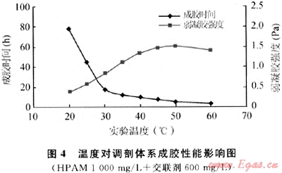 溫度是交聯(lián)化學(xué)反應(yīng)最敏感因素之一,尤其是對成膠時間的影響。在HPAM YG103弱凝膠交聯(lián)反應(yīng)中,過高的溫度會使弱凝膠破膠水化,筆者考察了30~50℃條件下調(diào)剖劑體系成膠性能的影響。實(shí)驗(yàn)中固定交聯(lián)體系配方,將體系溶液分別置于不同溫度的水浴中,定期觀測交聯(lián)體系的成膠時間及形成弱凝膠的強(qiáng)度。實(shí)驗(yàn)結(jié)果見圖4。