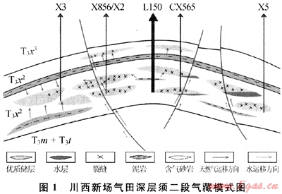 上三疊統(tǒng)須家河組氣藏是目前四川盆地西部(以下簡稱川西)坳陷深層天然氣勘探熱點,亦是儲產(chǎn)量增長的主要層段,其主力氣藏為須家河組須二段氣藏。2000年,在川西新場氣田須二段中部T3x24(4砂組)儲層成功鉆獲無阻流量151.4×104m3/d、穩(wěn)定產(chǎn)量38×104m3/d的高產(chǎn)工業(yè)氣井——X851井,展現(xiàn)了川西坳陷中段深層致密碎屑巖氣藏巨大的勘探潛力。但氣藏的勘探開發(fā)難度極大,其后在同一構(gòu)造帶上部署的CX560、CX565、CL562、L150井等多口深井效果并、不理想且產(chǎn)能差異極大,主要原因為儲層為典型致密碎屑巖儲層,受裂縫網(wǎng)絡(luò)分布影響,氣藏非均質(zhì)性極強[1~2]。