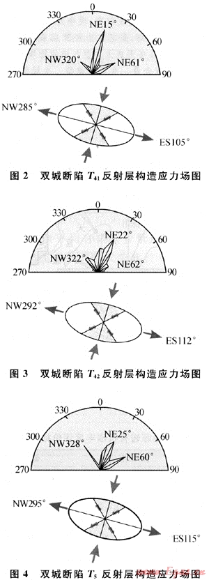經(jīng)地震剖面分析,確定火石嶺組-營城組火山巖段(T5-T4)形成于同一伸展構(gòu)造應(yīng)力場,北北東向、北西向、北東東向構(gòu)造具有不同性質(zhì),因此通過雙城斷陷的斷陷期邊界斷層不同期次、不同方向的走向斷層統(tǒng)計分析,并做玫瑰花圖,用以判斷雙城斷陷在T5-T4期間不同期次的優(yōu)勢應(yīng)力方向(圖2、3、4)。在此基礎(chǔ)上,利用兩個張扭性斷面優(yōu)勢方向的夾角平分線判斷該期次的應(yīng)力場主伸展方向[5]。