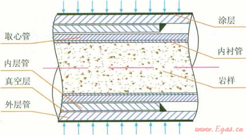 系統(tǒng)保溫筒設(shè)計如圖2,采用超高真空絕熱方式,在內(nèi)層管、外層管間抽真空;高真空層內(nèi)外表面噴涂等離子隔熱材料;外層管表面涂防陽光輻射涂料;在取心筒外面直接用保溫材料實施保溫。保溫結(jié)構(gòu)設(shè)計簡單,現(xiàn)場可操作性強,使用方便。