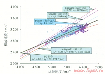圖1 經(jīng)驗公式與實測縱、橫波數(shù)據(jù)關系圖