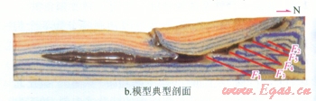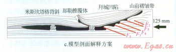 從實(shí)際地震剖面與物理模擬的結(jié)果對比圖(圖3-b、c)來看,該實(shí)驗(yàn)基本將阿瓦特段的構(gòu)造變形情況真實(shí)地再現(xiàn)了出來,物理模擬的構(gòu)造形態(tài)與地震剖面基本一致:鹽下發(fā)育4排疊瓦逆沖斷層,與地震剖面一致;物理模擬剖面斷層傾角約30°,地震剖面斷層傾角40°,二者基本吻合。該實(shí)驗(yàn)在邊界條件的設(shè)計上和構(gòu)造變形的過程上與真實(shí)情況基本一致,符合相似性原則,可以作為對該地區(qū)構(gòu)造解釋的有效證據(jù)。