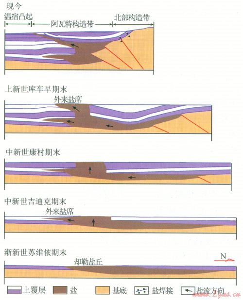 4)吐孜阿瓦特構(gòu)造主要分為2期:①早期發(fā)育鹽底辟構(gòu)造,吐孜阿瓦特南北兩翼發(fā)育鹽丘;②上新世南天山開始強(qiáng)烈抬升,吐孜阿瓦特地區(qū)受到強(qiáng)烈擠壓,發(fā)育鹽下逆沖斷層。