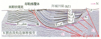 博孜段淺層為寬緩的向斜,構(gòu)造變形微弱,同構(gòu)造沉積特征清晰。淺層向斜北翼E2-3s發(fā)生前積作用,厚度由北往南減薄,表明漸新世鹽巖在沉積差異負(fù)載作用下發(fā)生流動變形,形成早期鹽撤凹陷;N1j—N1-2k下段地層基本等厚,僅在BZl井北側(cè)發(fā)生微弱加厚;N1-2k上段和N2k—Q呈北薄南厚的楔狀,地層傾角從深層到淺層變緩,為大型扇狀生長地層,表明博孜段淺層向斜(晚期鹽撤凹陷)開始形成于中新世晚期,并持續(xù)到現(xiàn)今。博孜段下伏鹽巖發(fā)生側(cè)向流動減薄,淺層凹陷北翼與基底直接接觸,發(fā)育鹽焊接構(gòu)造。基底發(fā)育隱伏斷層,形成疊瓦狀逆沖構(gòu)造,造成博孜段北翼抬升。
