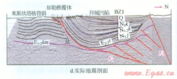 圖4-c、d、f為物理模擬實(shí)驗(yàn)的解釋方案與實(shí)際地震資料解釋方案的對比,顯然只有早期存在鹽底辟的模擬實(shí)驗(yàn)結(jié)果與地震剖面吻合,早期不存在鹽底辟的
