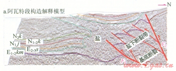 1)吐孜阿瓦特鹽下發(fā)育逆沖斷層,鹽上發(fā)育寬緩背馱向斜。分為3個帶:山前單斜帶、鹽下斷褶帶、前緣隆起帶。