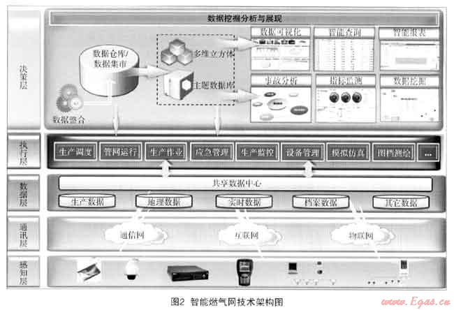 智能燃氣網(wǎng)是一個綜合的系統(tǒng)建設(shè)工程,它主要包括5個層次:物理感知層、網(wǎng)絡(luò)通訊層、共享數(shù)據(jù)層、運營執(zhí)行層、決策分析層。如圖2所示。
