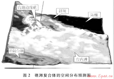 在精細層位對比解釋的基礎(chǔ)上,基于古地貌恢復(fù)的生物礁灘三維成圖,便可繪制出礁灘復(fù)合體的空間分布圖。圖2為根據(jù)三維地震資料繪制的飛仙關(guān)組沉積前古地貌展布網(wǎng),反映了長興組生物礁的空間展布,早期在臺地內(nèi)形成了灘相沉積,隨著長興期生物礁快速生長和加積,在臺地邊緣形成生物礁灘復(fù)合帶。礁灘復(fù)合體空間分布圖確定后,相應(yīng)的沉積相帶也可解釋出來,圖中可明顯地劃分出陸棚、斜坡、臺地邊緣礁、臺內(nèi)灘、開闊臺地等相帶。