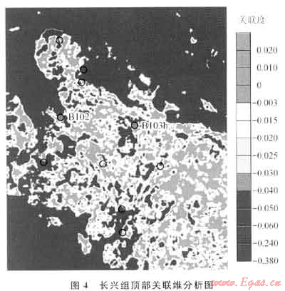 圖4是長興組頂部關(guān)聯(lián)維分析結(jié)果。實鉆的B102井和8103h井在長興組上部鉆遇礁蓋白云巖儲層,B102井測試獲工業(yè)氣流,不含水,而8103h井出水,且海拔位置比B102井還高,證明這2口井分屬不同的氣藏,儲層預(yù)測及反演結(jié)果難以進行區(qū)分,而基于波形復(fù)雜程度的關(guān)聯(lián)維分析表明兩二者之間存在變化且互不連通。因此可以利用反映波形復(fù)雜程度的屬性來刻畫儲層的非均質(zhì)性和復(fù)雜性,但無法區(qū)分礁和灘。