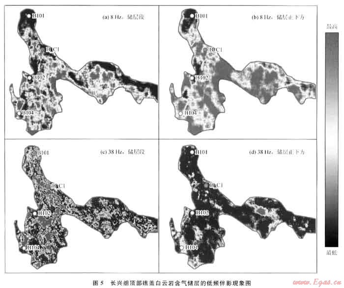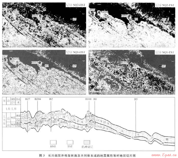 圖3是在長興期層序格架劃分基礎(chǔ)上,對兩個Ⅲ級層序中控制儲層發(fā)育的體系域進行地震屬性的等時地層切片,能較好地反映了長興組礁、灘體的發(fā)育和演化規(guī)律。長一段下部為海侵體系域(SQ1-TST),B1井及以西地區(qū)為開闊臺地相沉積,B1井以東相變?yōu)榕_地邊緣斜坡陸棚沉積,儲層不發(fā)育。長一段上部為高位體系域(SQ1-HST),B5井西南地區(qū)為臺地邊緣淺灘相沉積,淺灘相儲層發(fā)育;B1井以東相變?yōu)榕_地邊緣斜坡陸棚沉積,地層薄,儲層不發(fā)育。長二段下部為海侵體系域(SQ2-TST),B5井以西南地區(qū)為開闊臺地相沉積,局部地勢較高部位(如B101井)發(fā)育生屑白云巖儲層;B1、B5井以東地區(qū)相變?yōu)榕_地邊緣斜坡 陸棚沉積,儲層不發(fā)育。長二段上部為高位體系域(SQ2-HST),B5、B1井以西南地區(qū)為臺地邊緣礁灘沉積,儲層發(fā)育,物性好、厚度大、分布廣;B1、B5井以東地區(qū)相變?yōu)榕_地邊緣斜坡-陸棚沉積,儲層不發(fā)育。因此,長興組的儲層明顯受到沉積體系域的控制,主要發(fā)育在高位體系域內(nèi)的臺地邊緣礁灘相中,并且表現(xiàn)為早期以灘相沉積為主,晚期以礁相沉積為主,平面上具有前礁后灘的特點。
