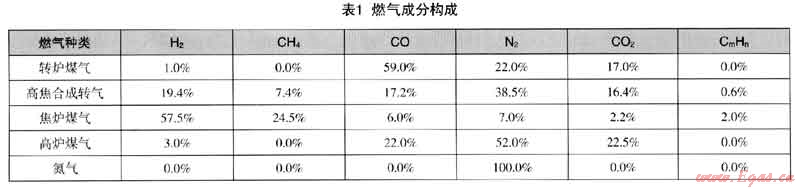 各種煤氣及氮?dú)獾某煞忠姳?,其中高焦合成轉(zhuǎn)氣是高爐煤氣和焦?fàn)t煤氣以一定比例合成,合成后的煤氣熱值與轉(zhuǎn)爐煤氣的熱值保持相等。從表1中可以看出,轉(zhuǎn)爐煤氣的主要可燃成分是一氧化碳,而高焦合成轉(zhuǎn)氣的主要可燃成分為氫氣、甲烷和一氧化碳,不可燃成分中,二氧化碳的比例基本相當(dāng),高焦合成轉(zhuǎn)氣中氮?dú)獾谋壤黠@大于轉(zhuǎn)爐煤氣。而當(dāng)使用氮?dú)馓娲郀t煤氣與焦?fàn)t煤氣合成轉(zhuǎn)氣后,合成轉(zhuǎn)氣中氮?dú)獾谋壤龑⒏摺?/span>