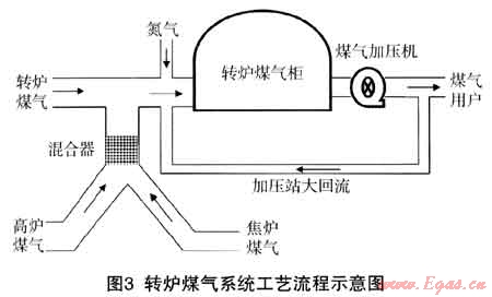 (2) 利用轉(zhuǎn)爐煤氣柜、煤氣加壓站、合成轉(zhuǎn)氣混合站等設(shè)施,在實(shí)際生產(chǎn)過程中町以實(shí)現(xiàn)焦?fàn)t煤氣和氮?dú)庵g的定量、均勻混合,合成后的混合氣可以通過加壓站供給用戶使用。