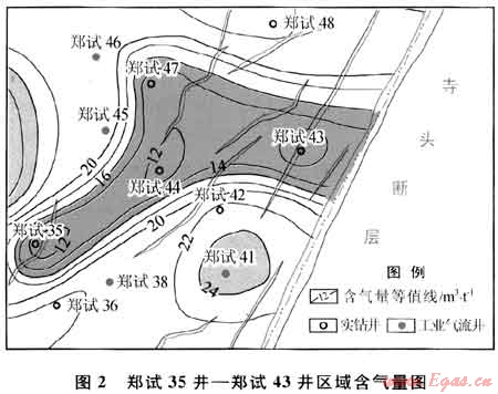 鄭試35井鄭試43井所在區(qū)域(圖2)靠近寺頭斷層,區(qū)域內(nèi)NNE向小斷層發(fā)育,而鄭試35井和鄭試43井均處于斷層附近,距離斷層小于100m3。斷層切割煤層會破壞頂?shù)装宓姆獯嫘阅埽铀倜簩託獾慕馕?、逸散,且部分斷層可能溝通煤儲層附近含水層,?dǎo)致煤層氣的溶解流失。因此,鄭試35井-鄭試43井區(qū)內(nèi)含氣量普遍較低,鄭試35井、鄭試43井的含氣量僅為3.24m3/t和8.06m3/t。