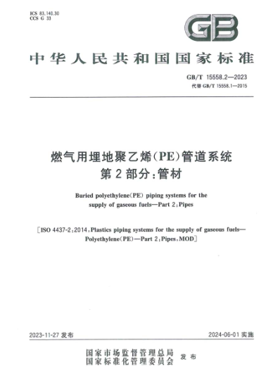 燃?xì)庥寐竦?a href=http://m.guoxinzhixin.com/e/tags/?tagname=%E8%81%9A%E4%B9%99%E7%83%AF target=_blank class=infotextkey>聚乙烯(PE)管道系統(tǒng) 第2部分:管材GB/T 15558.2-2023