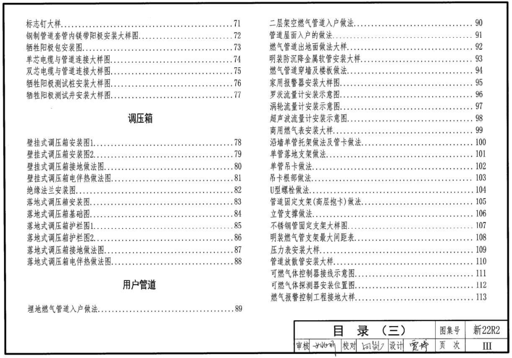3.1本圖集在原12R301的基礎(chǔ)上進行了修訂,共分成6個章節(jié):設(shè)計示例;閥井安裝;輸配管道;調(diào)壓箱;用戶管道;常用燃氣設(shè)備、閥門
